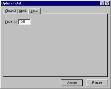 Fereastra Optiuni de hotel este alcatuita din trei pagini: In pagina Chitanta este descris formatul chitantei generata la achitarea convorbirilor (vezi sectiunea Plecare, pagina