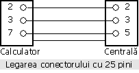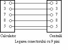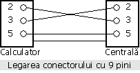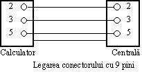 Conectorul din partea centralei este de tip "mama" cu 9 pini. Conectorul din partea calculatorului poate fi de tip "mama" cu 9.