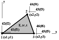 Elementul de saiba triunghiulara plana este elemental structural plan, de grosime, constanta, t, avand modulul de elasticitate, constant, E, si coeficientul lui Poisson ν, la care deplasarile extremitatilor se produc, sub actiunea fortelor corespunzatoare, in planul median al acestuia (figura 1