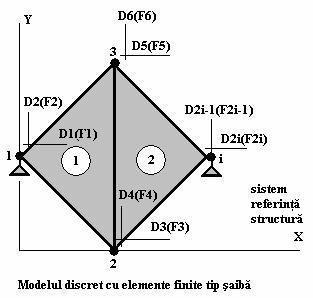 Pentru fiecare nod i, al unei structuri plane cu elemente de saiba triunghiulara (cazul diafragmelor plane) se definesc cate doi parametri principali D2i-1 si D2i, primul fiind definit ca deplasare dupa prima axa a reperului structurii (obisniut X), al doilea ca deplasare dupa cea de a doua axa a reperului structurii (obisnuit Y); pentru o structura cu n noduri se definesc 2n parametri principali. Parametrii secundari corespunzatori sunt fortele nodale F2i-1 si F2i; pentru o structura cu n noduri se definesc 2n parametri secundari.
