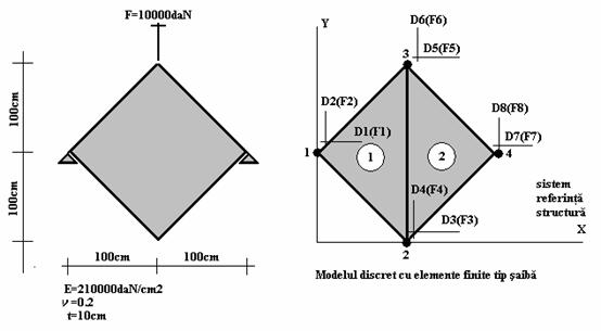 Enuntarea problemei: Sa se efecteze analiza statica a diafragmei plane modelata cu elemente finite tip saiba aflate in stare plana de tensiune (determinarea deplasarilor, fortelor din rezemari si a tensiunilor), schema statica, caracteristicile geometrice si mecanice, precum si incarcarile fiind precizate pe figura 2.1.