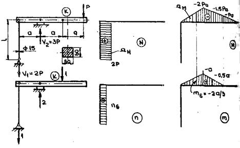 Se traseaza diagramele de forte axiale si de momente încovoietoare produse de forta P si de forta unitate. Deplasarea punctului K este: