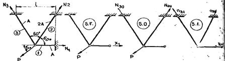 Sistemul este static nedeterminat întrucât apar trei reactiuni (N1, N2, N3) iar pentru echilibru se pot scrie numai doua ecuatii (sistem de forte concurente). Se mentin reazemele B si C, iar reazemul A se înlocuieste cu necunoscuta static nedeterminata X1 obtinându-se astfel sistemul fundamental (S.F.). eforturile produse în bare numai de forta P la sistemul fundamental (sistemul 0 - notat cu S.0.) sunt: