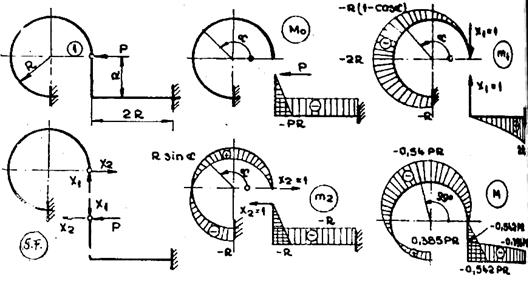 Sectionând cadrul în articulatia 1 se obtine sistemul fundamental (S.F.) forma dintr-o bara curba si una cotita, având ca necunoscute static nedeterminate eforturile din sectiune (forta axiala X1 si forta taietoare X2 , momentul încovoietor în articulatie fiind nul). Forta P se poate împarti în orice raport celor doua bare, sau se poate stabili numai pe una din bare (pe bara cotita, în cazul de fata).