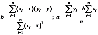 Determinarea parametrilor dreptei de regresie se poate face cu metoda punctelor selectionate sau cu metoda celor mai mici patrate, ultima fiind cea mai folosita. Astfel, acestia se determina prin minimizarea sumei patratelor diferentelor dintre valorile experimentale si cele obtinute prin regresie [8; 93]. In final se obtin expresiile: