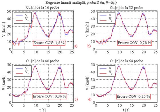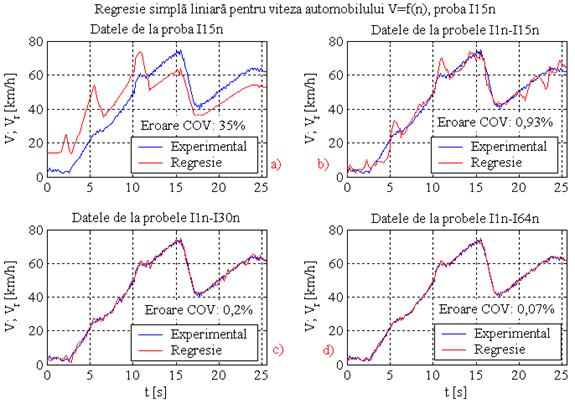 Asa cum se constata din fig.13, precizia de modelare a dinamicii automobilului prin regresie liniara simpla creste o data cu luarea in considerare a mai multor probe experimentale pentru dependenta vitezei V in functie de turatia n a motorului. Din studiul realizat a mai rezultat ca regresia simpla liniara nu ofera totdeauna modele matematice care sa satisfaca o precizie acceptabila, erorile obtinute fiind prea mari.