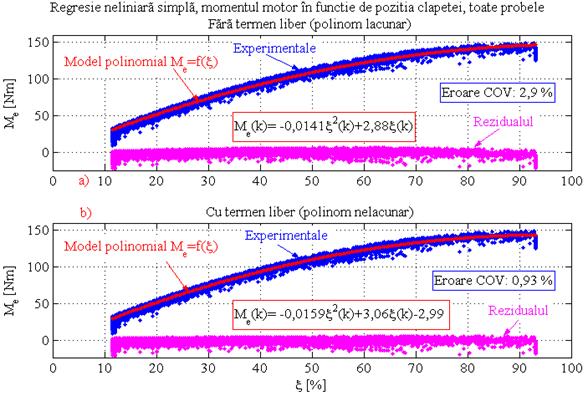 In fig.38 se prezinta un model generalizat pentru toate cele 64 probe experimentale, cu regresii ale momentului motor functie de pozitia clapetei obturatoare. Se constata ca erorile COV cresc in cazul general, deci precizia de modelare scade o data cu marirea numarului datelor experimentale, adica invers fata de cazul regresiilor liniare. In plus, se constata o analogie valorica a coeficientilor regresiilor prezentate.