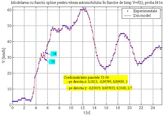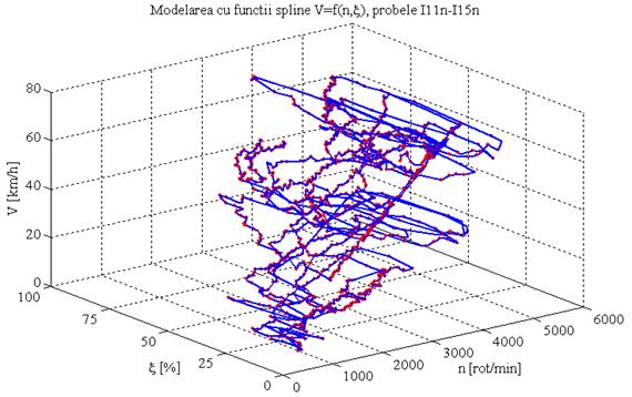 In fig.56 se prezinta rezultatul modelarii cu functii spline pentru stabilirea unei regresii multiple neliniare care sa ofere dependenta vitezei de deplasare V in functie de turatia n si pozitia clapetei obturatoare ; din motive de vizibilitate, pe grafic sunt redate doar cinci probe experimentale (I11n-I15n).