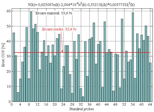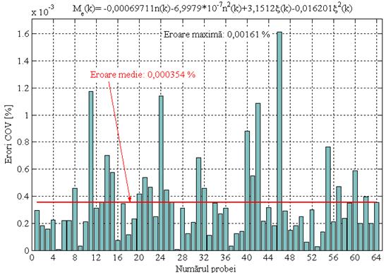 In partea superioara a graficului din fig.50 sunt redate expresiile pentru regresia neliniara multipla valabila la toate probele experimentale, ce ofera variatia mometului motor Me in functie de turatia n si pozitia clapetei . Graficul ce contine valorile erorilor COV pentru toate probele, arata ca regresiile adoptate asigura o precizie foarte mare.