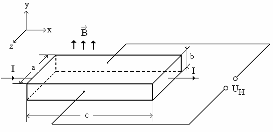 Dimensiunile probei semiconductoare (p-Ge) si directiile de aplicare a cāmpurilor electric si magnetic sunt aratate īn fig. 2: a = 10 mm; b = 1 mm; c = 20 mm. Rezistenta electrica a probei este R = 35 Ω.