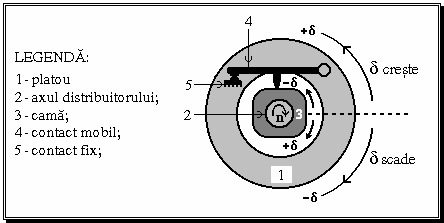 Modificarea unghiului de avans se realizeaza actionând, fie asupra platoului pe care se afla plasate contactele ruptorului, fie asupra camei care actioneaza ruptorul. Rotirea platoului în sensul de antrenare al axului ruptorului are ca efect scaderea unghiului de avans, iar rotirea în sens contrar are ca efect cresterea unghiului de avans (fig. 3). Dispozitivul de avans functie de sarcina actioneaza asupra platoului.