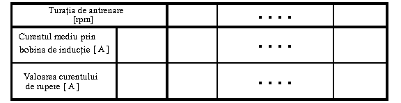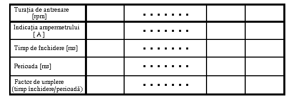 - pentru fiecare turatie de antrenare se noteaza: valoarea curentului indicat de instrumentul magnetoelectric, timpul de închidere si perioada semnalului vizualizat cu ajutorul osciloscopului la bornele rezistentei Ra;
