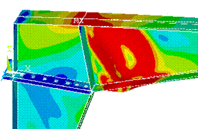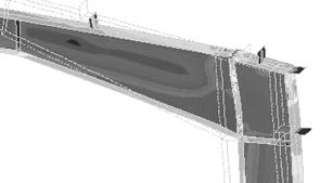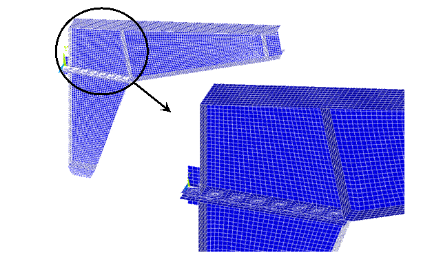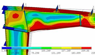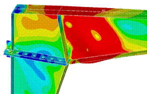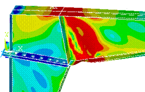 Îmbinarile au fost verificate în conformitate cu metoda componentelor, rezultând în final capacitatea portanta a îmbinarii, tinându-se cont de influenta diferitelor componente. De asemenea au fost analizate si prin intermediul unor analize elasto-plastice cu MEF, utilizând pentru discretizare elemente de tip shell, iar intre placile de capat au fost utilizate elemente de contact (Figura 4.3).