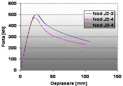 In urma analizelor neliniare elasto plastice au fost trasate curbele de comportament corespunzatoare fiecarei îmbinari, (forta-deplasare), vezi Figura 4.5. In Tabelul 4.3 sunt trecute valorile fortelor ultime si elastice corespunzatoare fiecarei îmbinare în parte, cat si raportul dintre aceste doua.