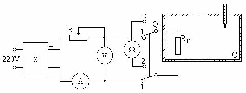 Constanta de timp termica t se va masura cu cronometru. Pentru acesta se realizeaza schema din figura 3 cu comutatorul Q pe pozitia 1 alimentand astfel termistorul aflat la temperatura camerei cu o tensiune de 10V. La aplicarea tensiunii prin termistor trece un curent (la inceput de valoare mica) care il incalzeste, deci termistorul isi va modifica rezistenta. Variatia rezistentei duce la variatia curentului (creste) care marindu-se incalzeste si mai mult termistorul. Astfel pe ampermetru se va observa cresterea curentului prin termistor de la o valoare minima la o valoare maxima care se determina in prealabil din relatia: