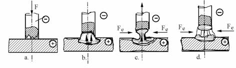 Punctele de contact între electrod si piesa (figura 5.1.a), care constituie locurile de strangulare a liniilor de curent se vor încalzi pâna la temperatura de topire, datorita curentului de scurtcircuit mare. Sub influenta fortei de apasare F numarul punctelor de contact va creste continuu si zona de trecere electrod si piesa va fi formata dintr-o punte de metal lichid (figura 5.1.b). La ridicarea electrodului de pe piesa (figura 5.1.c) odata cu alungirea puntii de metal, datorita fortelor electromagnetice Fe se produce si o strangulare a ei. Aceasta determina o crestere a rezistentei electrice care conduce la cresterea temperaturii acestei portiuni. La atingerea temperaturii de fierbere a metalului are loc ruperea puntii metalice si formarea vaporilor metalici care fiind usor ionizabili asigura trecerea curentului în continuare sub forma unei descarcari în arc (figura 5.1.d).