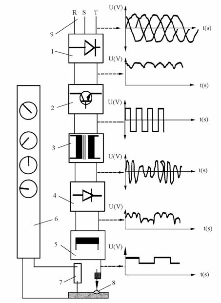 Curentul alternativ dat de reteaua de alimentare trifazica este redresat (1) si prin intermediul comutatorului cu tranzistor (2) este transformat în curent alternativ de înalta frecventa f > 20 kHz.
