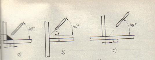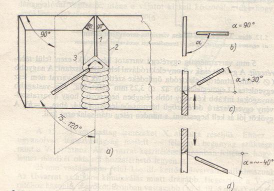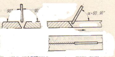Electrodul se conduce perpendicular pe cele doua componente în sectiune transversala, si la un unghi de 60-900 fata de perpenduculara sectiunii longitudinale în directia de sudare ( vezi figura 5.11)