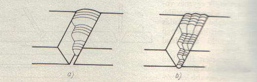 Ca sa avem patrundere corespunzatoare, radacina se va suda cu electrod cu diametru de 2,5 mm . În functie de grosimea componentelor se va suda în mai multe straturi (vezi figura 5.14)