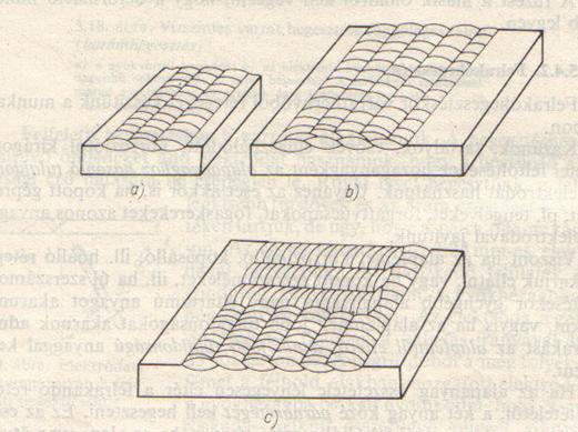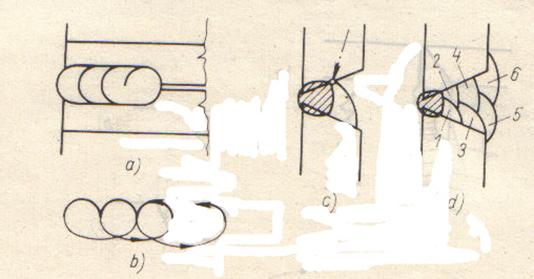 a) conducerea electrodului în cele trei straturi (punctul reprezinta oprire) b) sectiunea cordonului inaintea ultimului strat c) dupa ultimul strat