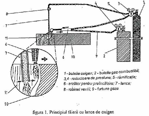 Preincalzirea se face cu arzator normal, oxigenul se aduce in zona de taiere cu ajutorul lancei.