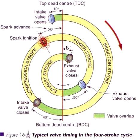 Supapa de admisie deschizandu-se exact inainte ca pistonul sa atinga PMS si inchizandu-se imediat dupa ce pistonul trece de PMI, determina timpul de admisie extinzand astfel la maximum durata alocata intrarii amestecului in cilindru. Aceste momente se numesc atacul supapei si eliberarea supapei. Similar,supapa de evacuare se deschide imediat inainte de PMI si se inchide imediat dupa PMS pentru timpul patru (de evacuare) si inceputul timpului de admisie.