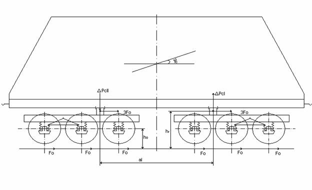 raza curbei Rc=250 [m] ; hs=150 [mm] ; Vc=50+n=55 [km/h] ; coeficientul de suplete S=0,2 ; deplasarea transversala a locomotivei l=30[mm] ; suprafata laterala a locomotivei Sc=40 [m2] ; forta specifica a vantului W=500 [N/m2] ; forta normala de apasare a sabotului pe roata N=100 [kN] ; distanta dintre atarnatori d=1100 [mm] ; coeficientul de suprasarcini dinamice Ks=3+0,n=3,5 ; rigiditatea arcurilor din suspensia cutiei Kc=800 [N/mm].
