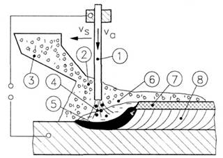 Aceste procedee se incadreaza in categoria procedeelor de sudare electrica cu arc acoperit. Arcul se formeaza intre piesa si electrodul Arcul arde sub un strat de flux (2), care curge din buncarul (3). Picaturile de metal (4) ajung in baia de sudare (5) in conditiile unei bune protectii, asigurate de fluxul topit (6) precum si de atmosfera gazoasa creata. Dupa solidificarea stratului de flux topit, acesta formeaza un strat de zgura (7) ce se desprinde usor de cordonul de sudura (8).