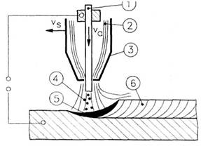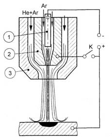 In cazul acestui procedeu de sudare, arcul electric se formeaza intre electrodul (1), din wolfram sau zirconiu, si ajutajul (2) si este puternic strangulat mecanic si electromagnetic. Prin ajutajul (2) se trimite un gaz plasmogen (argon), care formeaza, prin disociere si ionizare, plasma. Temperatura jetului de plasma este foarte ridicata (10000 - 24000)°C. Pentru protectia arcului si racirea ajutajului se sufla prin ajutajul (3) un gaz de protectie (heliu+argon). Arcul ce se formeaza initial intre electrod si ajutaj (arc pilot) este apoi transferat, prin deschiderea comutatorului K, asupra piesei care este legata la polul pozitiv al sursei.