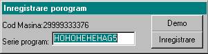 Inregistrarea programului se face prin comunicarea numarului ce reprezinta Cod Masina si a numarului si datei facturii de achizitie a softului firmei furnizoare. Aceasta va va furniza o serie de program care este unica pentru un calculator. Aceatsa se va introduce in campul Serie program si se va apasa butonul Inregistrare. Daca se doreste contiunarea lucrului in versiune DEMO atunci se apasa tasta Demo. Dupa introducerea unei serii valide, aceasta fereastra nu va mai aparea si programul va functiona in regim normal.