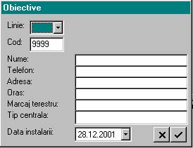 Astfel, in campul linie se introduce linia pe care se asteapta mesajele de la obiectiv. Se selecteaza linia in cazul in care un obiectiv comunica exclusiv pe o linie. In cazul in care centrala comunica pe oricare din linii, sau in cazul in care in dispecerat liniile telefonice raspund la acelasi numar prin trunchi telefonic, trebuie selectat X, ceea ce inseamna ca mesajul ii ieste destinat spre prelucrare obiectivului indiferent pe ce linie vine acesta. Codul obiectivului este codul programat pentru transmisie in centrala de alarma si este <AccCod>. Acesta trebuie sa fie unic in sistem. Apoi urmeaza campurile de descriere a obiectivului care sunt Numele, telefonul pe care este conectat centrala, adresa, orasul, marcaj terestru (un indicator, un camp de caroiaj de harta, etc), tipul centralei si data instalarii. Aceste date sunt doar informative dar va recomandam completarea lor. Validarea se face cu semnul de bifare, abandonarea adaugarii se face cu X.