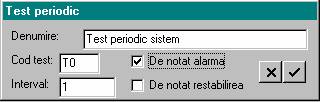 Cimpurile care intra in definirea acestor tipuri de zone si difera de cele de mai sus sunt Cod test, ce reprezinta codul de mesaj care se receptioneaza la testul periodic, precum si intervalul de ore la care el trebuie sa se repete. La aceasta zona nu se poate defini grafica.