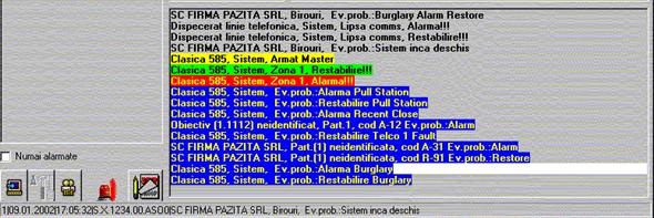 Pe fundal rosu sunt sunt mesajele ce reprezinta alarme zone si se cere notarea lor de catre dispecer.