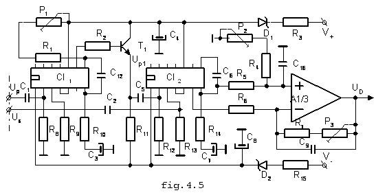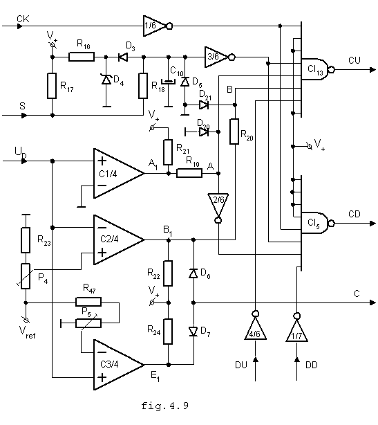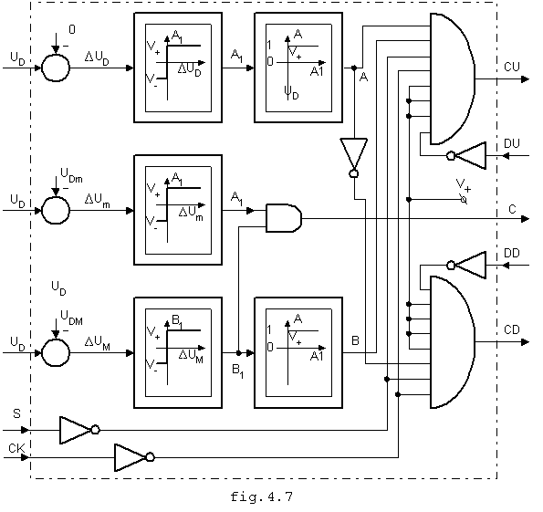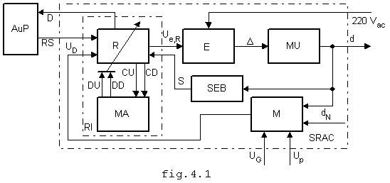 Daca UD este mai mica decāt o valoare minima reglata, Ud,m s-au mai mare decāt o valoare maxima reglata Ud,M se inhiba comanda elemen-tului de executie conform [4.1],[4.3] si [4.11]. Elementul de urmarire si memorare avānd schema bloc din figura 4.8 furnizeaza o tensiune continua Ue,R masura a continutului NBSR din structura sa conform relatiei: