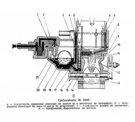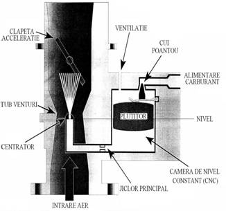 Benzina este aspirata prin putul de benzina, datorita depresiunii create si debitul este reglat prin jiclorul principal de benzina.