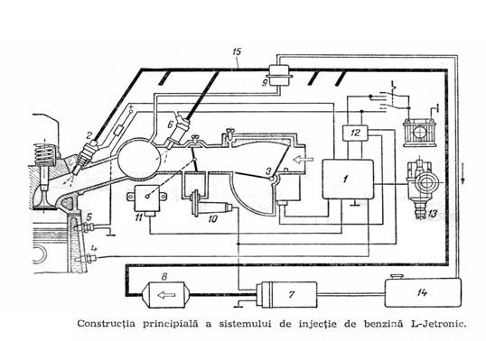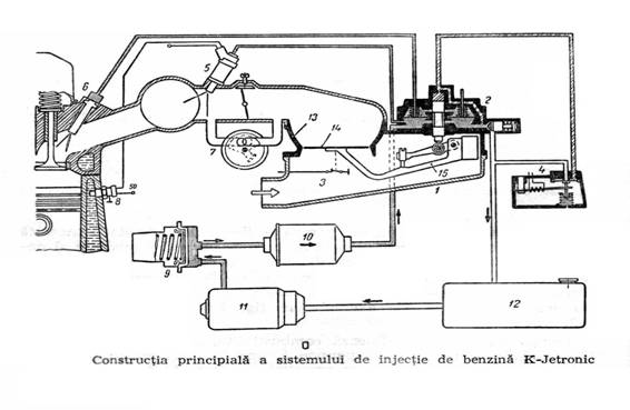 1–Corp debitmetru aer; 2-Regulator debit benzina; 3-Cititor pozitie clapeta aer; 4-Supapa electrica de imbogatire pt. pornire la rece; 5-Injector de pornire; 6-Injector necomandat; 7-Regulator de aer ralanti; 8-Senzor temperatura; 9-Acumulator presiune; 10-Filtru benzina; 11-Pompa benzina; 12-Rezervor benzina; 13-Ajutaj debitmetru aer; 14-Clapeta debitmetru; 15-Tija reglaj