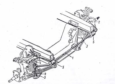 Dupa cum se observa in imaginea urmatoare, stabilizatorul se compune din bara (1) in forma de U, montata transversal pe cadrul automobilului in doua bucse de cauciuc (5).