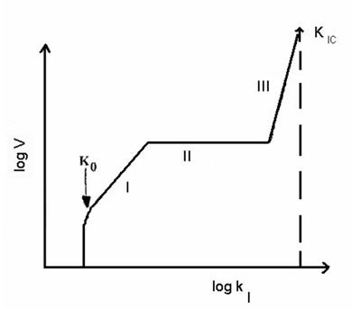 Se observa ca aceasta curba este trimodala. In prima zona se constata ca valoarea tenacitatii creste datorita aparitiei fenomenului de armare. Apoi urmeaza o perioada II in care viteza de propagare a fisurii este constanta, dupa care se atinge o valoare critica care provoaca ruperea. Comportarea mecanica a materialului este controlata prin cresterea fisurii in zona I, deoarece in zona II desi este constanta, viteza de propagare este prea mare.