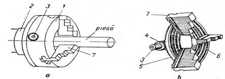 Fig. 1.2. Universal pentru strung: a -vedere, b - mecanismul pentru actionarea concentrica a falcilor: 1 - corp, 2 - flansa, 3 - gaura patrata pentru cheie, 4 - pinion conic, 5 - coroana conica, 6 - canal spiral.