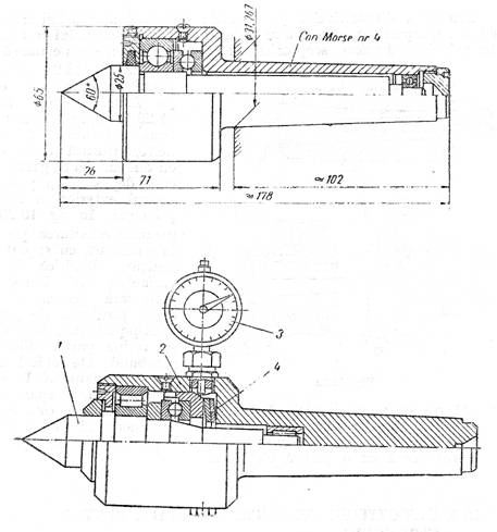 în fig.1.3.b) apare un varf rotativ prevazut cu aparat indicator al încarcarii. Aparatul este un comparator cu cadran al carui palpator vine în contact cu piesa conica 2. Prin încarcarea axiala a vîrfului de centrare 1 acesta se deplaseaza spre dreapta deformînd elastic arcurile taler 4. Deplasarea este proportionala cu sarcina astfel ca la comparator, care este gradat în unitati de forta, se citeste valoarea acestei sarcini.