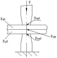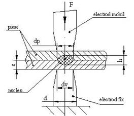 Formarea punctului de sudura īntre cele doua piese se explica prin faptul ca rezistenta electrica de contact dintre cele doua piese Rpp are valori mai mari decāt celelalte rezistente aflate īn circuitul de sudare: Rep - rezistenta electrica de contact dintre electrozi si piese si Rp - rezistenta electrica a pieselor (fig. 1b). Efectul rezistentei electrice dintre electrozi si piese se diminueaza prin utilizarea unor electrozi buni conducatori de electricitate.
