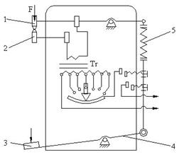 Electrodul fix 1 si electrodul mobil 2 sunt legati la secundarul transformatorului Tr (fig. 2). Prin apasarea pedalei 3 cu piciorul, forta se transmite, printr-un sistem de pārghii 4, la electrodul mobil, care este adus īn contact cu piesele ce urmeaza a fi sudate. Forta de apasare F este reglata prin arcul 5.