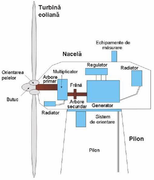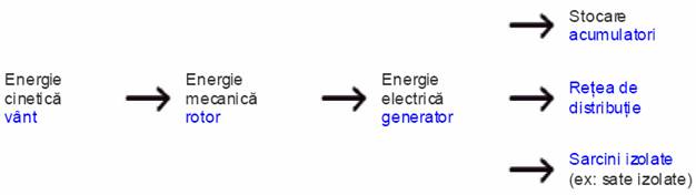Energia de origine eoliana face parte din energiile regenerabile. Aero-generatorul utilizeaz energia cinetica a vantului pentru a antrena arborele rotorului sau: aceasta este transformat in energie mecanica, care la randul ei este transformata in energie electrica de catre generatorul cuplat mecanic la turbina eoliana. Acest cuplaj mecanic se poate face fie direct, daca turbina si generatorul au viteze de acelasi ordin de marime, fie se poate realiza prin intermediul unui multiplicator de viteza. In sfarsit, exista mai multe posibilitti de a utiliza energia electrica produsa: fie este stocata in acumulatori, fie este distribuita prin intermediul unei retele electrice, fie sunt alimentate sarcini izolate. Sistemele eoliene de conversie au si pierderi. Astfel, se poate mentiona un randament de ordinul a 59 % pentru rotorul eolienei, 96% al multiplicatorului. Trebuie luate in considerare, de asemenea, pierderile generatorului si ale eventualelor sisteme de conversie.