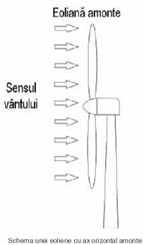 Dispunerea amonte a turbinei este cea mai utilizata, deoarece este mai simpla si da cele mai bune rezultate la puteri mari: nu are suprafete de directionare, eforturile de manevrare sunt mai reduse si are o stabilitate mai bun. Palele eolienelor cu ax orizontal trebuiesc totdeauna, orientate in functie de directia si forta vantului. Pentru aceasta, exista dispozitive de orientare a nacelei pe directia vantului si de orientare a palelor, in functie de intensitatea acestuia. In prezent, eolienele cu ax orizontal cu rotorul de tip elice, prezinta cel mai ridicat interes pentru producerea de energie electrica la scara industriala.