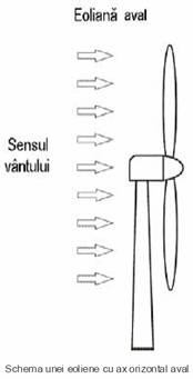 Aval: vantul sufla pe spatele palelor, fata de nacela. Rotorul este flexibil si se auto-orienteaza (fig.9)