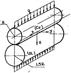 2. Sa se determine cantitatea cu care se apropie cilindrii īn contact din figura 2, tensiunile pe linia mediana de contact si tensiunile īn vecinatatea zonei de contact (z = b, y = 1,2b). Se dau: q = 10 N/mm; ECu = 14 · 104 N/mm2; EOL = 21 · 104 N/mm2 ; v Cu = 0,37; v OL = 0,3; R = 25 mm.