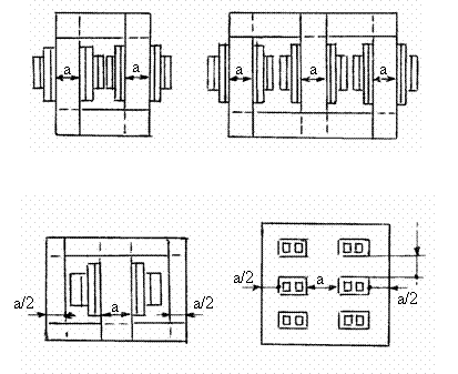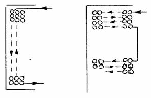 Īnfasurarile cu numar mare de spire si valori reduse ale curentului, care nu necesita mai multe conductoare īn paralel, se executa sub forma de īnfasurari cilindrice stratificate, sau īnfasurari cu galeti separati, fig. 3.5. a , b). Atunci cānd valoarea ridicata a curentului impune utilizarea mai multor conductoare īn paralel, pentru ca īn fiecare conductor elementar refularea curentului sa fie neglijabila, īn executia īnfasurarilor cilindrice elicoidale sau īn galeti se efectueaza transpozitii ale conductoarelor īn paralel; aceasta solutie tehnica face ca curentul total sa se distribuie uniform pe toate caile de curent īn paralel, fig. 3.6.