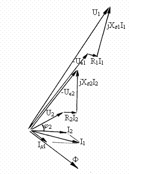 Pornind de la fazorul U2 al tensiunii secundare si considerānd curentul de sarcina I2 ca parametru, rezulta diagrama de fazori din figura 3.18, care determina succesiv tensiunile electromotoare Ue1, Ue2, fluxul F, curentul de magnetizare Im, curentul I1 si tensiunea de alimentare U1. Curentul Im are expresia
