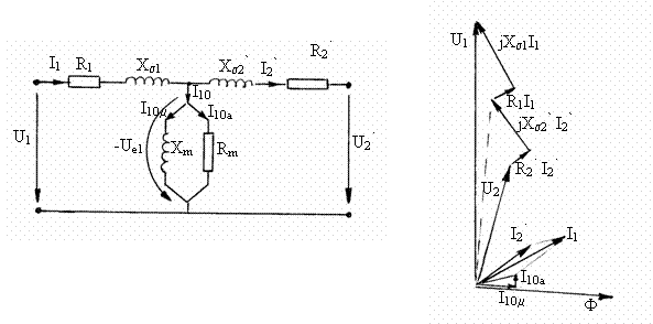 Completarea schemei echivalente din figura 3.19 pentru a considera si pierderile īn miez presupune conectarea rezistentei Rm īn paralel cu reactanta utila Xm, , fig. 3.20. Corespunzator acestei scheme, curentul I10 absorbit de transformator la mersul īn gol are o componenta reactiva de magnetizare I10m si o componenta activa I10a , corespunzatoare pierderilor īn miez.