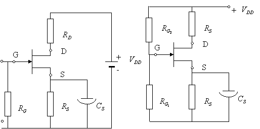 Īn figura 2.26 sunt prezentate schemele clasice de polarizare a tranzistorului cu efect de cāmp īn zona activa de functionare.